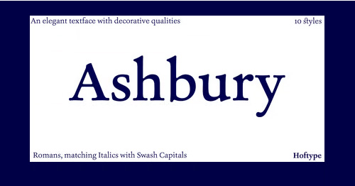 Ashbury derives its inspiration from 18th century transitional types such as Caslon and Baskerville. It is, however, not a revival but interprets formal aspects in a new and individual fashion. With a flowing outline, it remains warm and pleasant but assertive because of its solid stroke weights. It is very well equipped for a wide range of ambitious applications. Ashbury comes in ten styles, in OpenType format, and with extended language support for more than 40 languages. All weights contain small caps, swash capitals, standard and discretional ligatures, proportional lining figures, tabular lining figures, proportional old style figures, tabular old style figures, matching currency symbols, fractions, and scientific numerals.